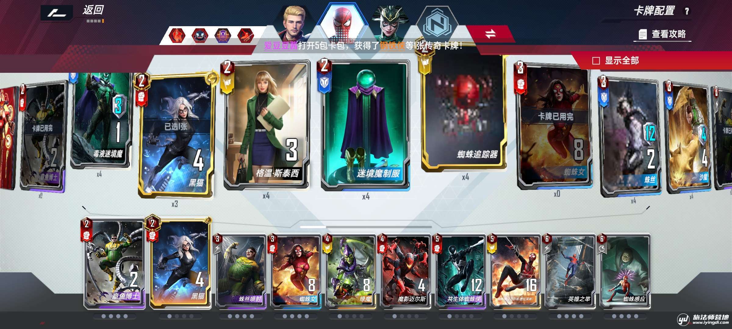 - 蜘蛛侠除了章鱼博士,蛛丝喷射,英雄之举外,其他卡牌都可以被替换,蜘蛛女在通常情况下不留到决赛阵容,除非黄队光谱多动惊过多,可以在一号位放蜘蛛女破坚甲,二号位章鱼哥大杀四方。