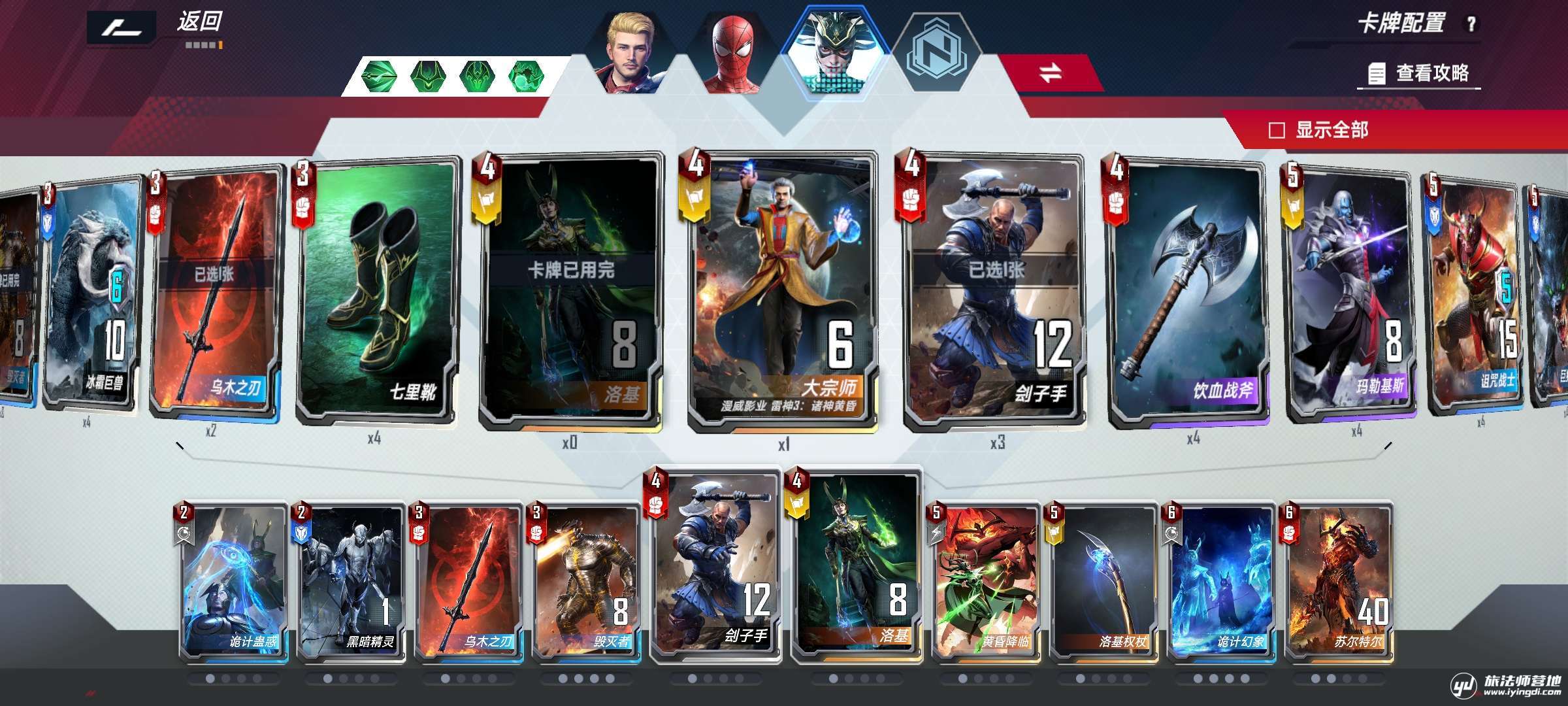- 海拉这边有条件的可以带上两张或四张洛基,作为季票玩家,一张洛基就是我最后的波纹了!_(:з」∠)_除了毁灭者和洛基其他的卡都可以替换。黄昏降临作为一张摸奖卡,携带只是个人喜好,可以替换为其他,不过在使用过程中经常可以出毁灭者和苏尔特尔,毕竟独行卡池较小。
