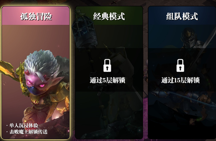 进入游戏后选择自己心仪的武器就可以进入深渊进行冒险了,刚开始只能进入孤独冒险模式,但随着逐渐深入就可以解锁经典模式和组队模式。经典模式会有其他玩家乱入,有些玩家会帮助你,还有些玩家会不怀好意与你PK将你击败。组队模式可以和其他玩家一起进行冒险并且在这个模式中装备掉率会有所提高是刷装备的不二之选。