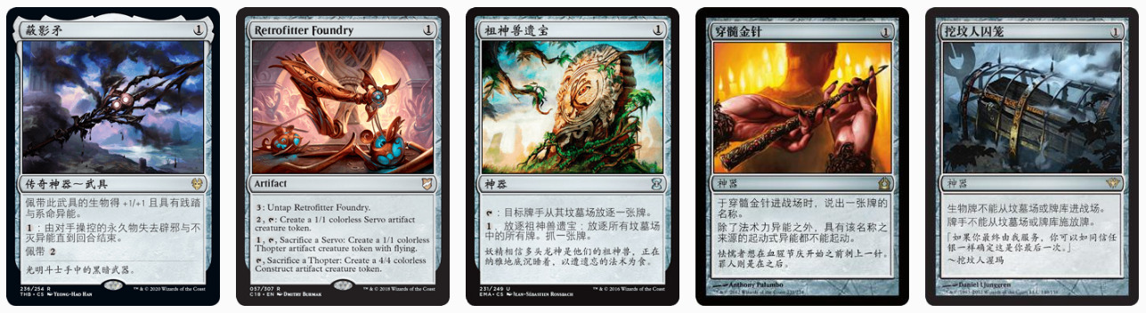 在对抗GW深渊或妖精这样比较慢的组合技牌时,三回合的穿髓金针或挖坟人囚笼确实可以以无克撒传DNT无法获得的方式撕裂一个缺口赢得游戏。更重要的是,在对抗fair时,无论导出祖神兽遗宝处理天怒泰坦乌洛或龙怒通念师,还是用改良式锻炉获得持续价值亦或者在长盘对局中找出乙太精瓶。蔽影矛在薪传中也是个不能被小觑的搜索目标,他可能是DnT最强的主牌之一。践踏可以让你的组构体撕破对面的防线打出实质伤害,系命可以让你赢得race特别是对抗绝密师套牌时。还能减轻其它形式的DnT仇恨牌带来的影响。