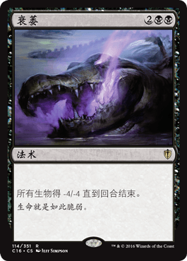本着防止封口诅咒或是扰咒法师的目的,一般史迹控制中神愤类单卡最好选择一些名称不相同的。可惜破灭并没有加入史迹豪华套餐,所以我们只能选择一些替代选项:肉钩大屠杀是MID环境给我们的新武器,理论上无上限的射程让它可以处理对手的寰宇盘蛇寇玛或是曳梦史芬斯,并且最重要的是,它可以让我们恢复一点关键的血量。我们不玩雪境,因此血洒雪原就免了。衰萎,耶赫尼的专才,黯影裁定,恐惧缚身,剜祭场呼喊都是可以使用的清场类咒语。如果你想玩玩心智窃贼的话恐惧缚身倒是可以用用,但是在这套构筑里它基本上严格弱于耶赫尼的专才。剜祭场呼喊射程太短,而黯影裁定费用太高还会误伤自己的揭帷娜尔施。但是它们都可以放逐一些麻烦的威胁,因此出现在备牌。煤烟仪式和生灵绝灭也是有一定竞争力的选项。如果你想用灵光乍现加汹涌巨械的组合的话,生灵绝灭其实是个不错的选择——完全可以不误伤自己,不过如果自己不带生物的话这牌就有些一般了。如果史迹没有那么多无私救助犬或者不屈护卫的话,煤烟仪式也是可以出场的——坏消息是腥红婚誓带给我们了欧雷巴卫士,煤烟仪式看起来暂时难有机会和前面的选项竞争了。综上所述,笔者选择了1衰萎1耶赫尼的专才2肉钩大屠杀来对付那些喜欢铺一桌子人的对手。