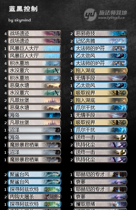 自从记忆丧失进入了史迹小黑屋后,控制套牌的日子可是一天不如一天了。而蓝黑控制——在记忆丧失尚在人世的时候都鲜有人问津的小众向控制套牌,在如今的史迹天梯可谓是步履维艰。笔者不推荐各位想要高效率上分的选手使用这套卡组:一来缺乏高效率的制胜手段,漫长的平均对局时间会显著减慢你上分的速度;二来蓝黑色组本身的缺陷,外加控制卡组的特点使得这套卡组只适合在BO3施展拳脚——而且对于许多威胁缺乏反制手段;另外在失去记忆丧失这个明星单卡之后,控制套牌的强度也大不如前了。不过在三打依尼翠系列带来了一系列新卡之后,这个思路依然有一定的竞争力。笔者在本月13号使用这套构筑打到了秘稀#373,决定来分享一下心得。