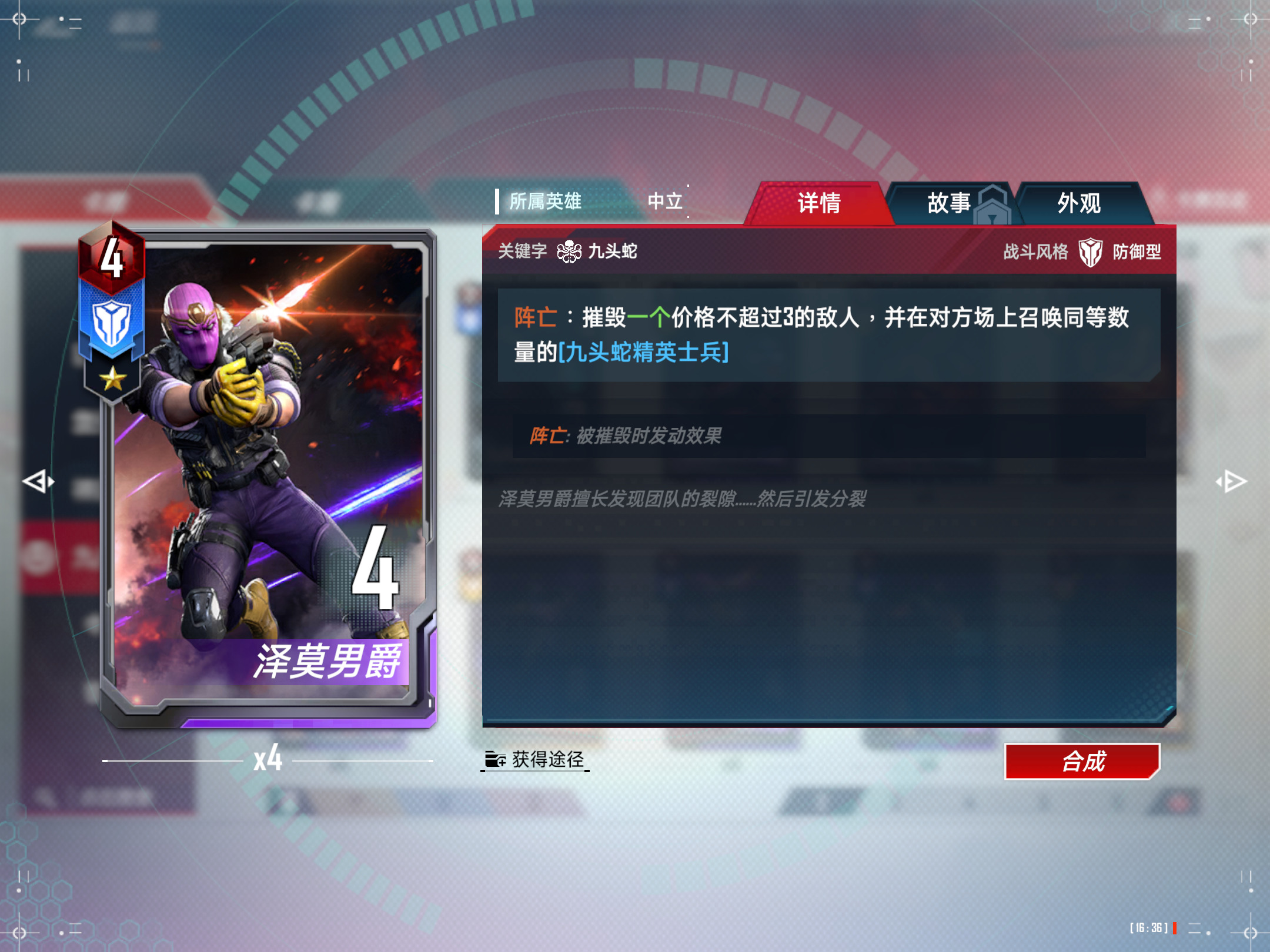 泽莫男爵:必须满编,核心卡,直接变形对面随从是取胜的关键,前期放在一号位送死,后期放在二号位防蛛丝喷射,如果对局黄队比较多就尽快凑出他的四连,打黄队泽莫男爵永远放一号位。