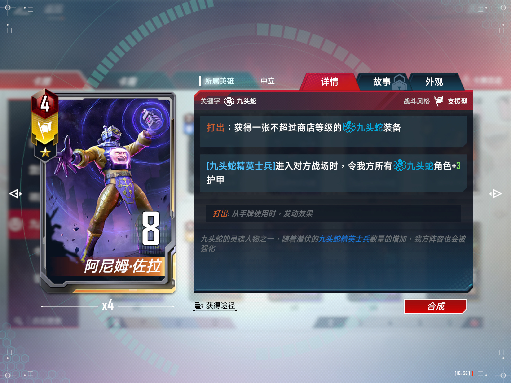 阿尼姆·佐拉:必须满编,九头蛇补给员,发武器加护甲都要靠他,七回合前千万不要为了赌他出5费装备而提前上本打乱节奏。