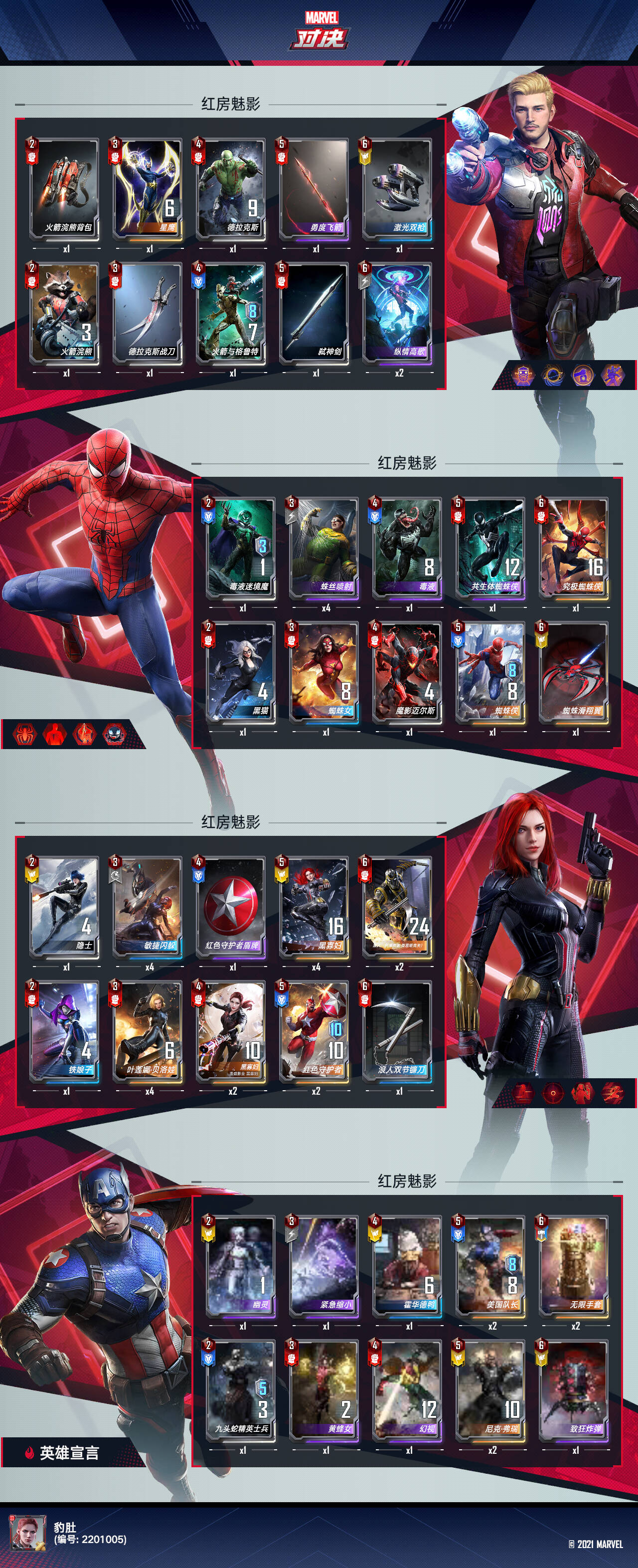 此卡组本质为速五单核卡组,单带了美队。凯旋被削后,所有速五卡组的使用体验都好了不少。得益于寡妇吸取对方身材的特殊机制,当前天梯环境下,此卡组面对各路卡组均有一战之力。