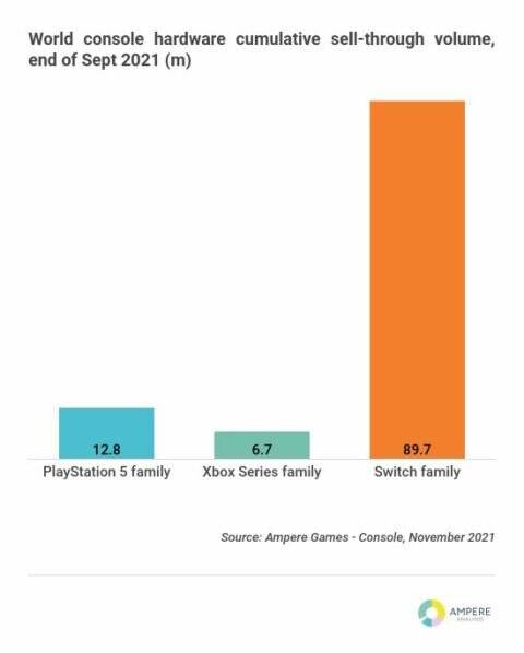 安培分析公司估计,截至2021年9月底,XSX|S已售出670万台,PS5系列售出1280万台。任天堂Switch系列已经在市场上销售了3年多,已经售出了8970万台。