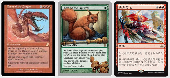 第一张化身________牌是劫运降临裡的Form of the Dragon。这个咒语会代表你—牌手—变成龙。这张牌十分受欢迎,因此我们接着在Unhinged裡设计了 Form of the Squirrel,并在稍晚的决胜依夏兰裡设计了化身恐龙。依尼翠:腥红婚誓是一个吸血鬼系列,我们何不试着製作一张化身吸血鬼呢?第一个尝试会把你的生命值转变为血滴衍生物。除去生物可以获得更多血滴衍生物,但受到伤害你将会失去血滴衍生物。