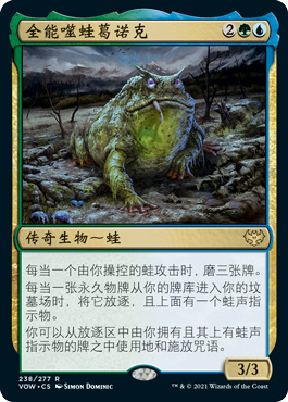在我们把系列移交给Adam之后,他做了两个大胆的决定。其一,他决定移除多重增幅的咒语;其二,他决定这个位置将会是一张传奇蛙。最早版本的蛙有闪现(这属于两个颜色都有的异能)以及可以在「进战场」时拿回一张牌的异能。这个版本有些平淡,且在纯绿就可以完成,所以系列设计做了另一个尝试: