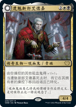 吸血鬼+2/+0最后有些太强,所以我们把基本的异能从+1/+0改为+0/+1。系列设计团队决定牌的背面要有一些除了把艾德嘉带回来以外的功能,所以让它可以派出具繫命异能的1/1吸血鬼衍生物。转化费用需要牺牲三个吸血鬼,这和之前版本「需要三个回合来把艾德嘉带回来」的概念相符。