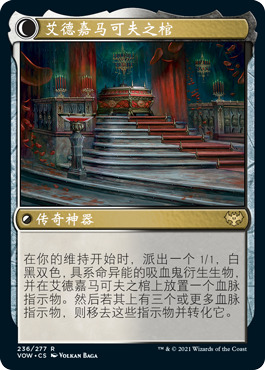 由你操控的其他生物得+0/+1。由你操控的其他吸血鬼得+1/+0。当艾德嘉马可夫死去时,将其在其操控者的操控下移回战场且已转化。
