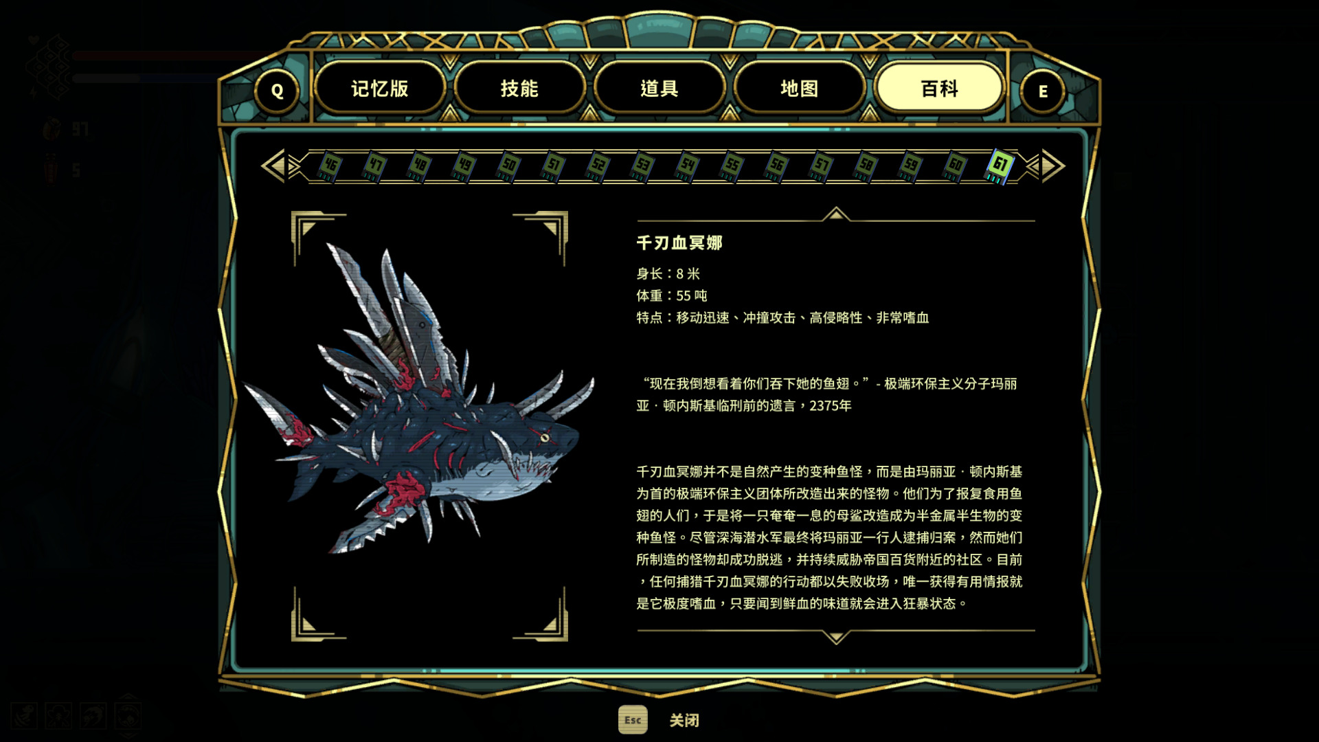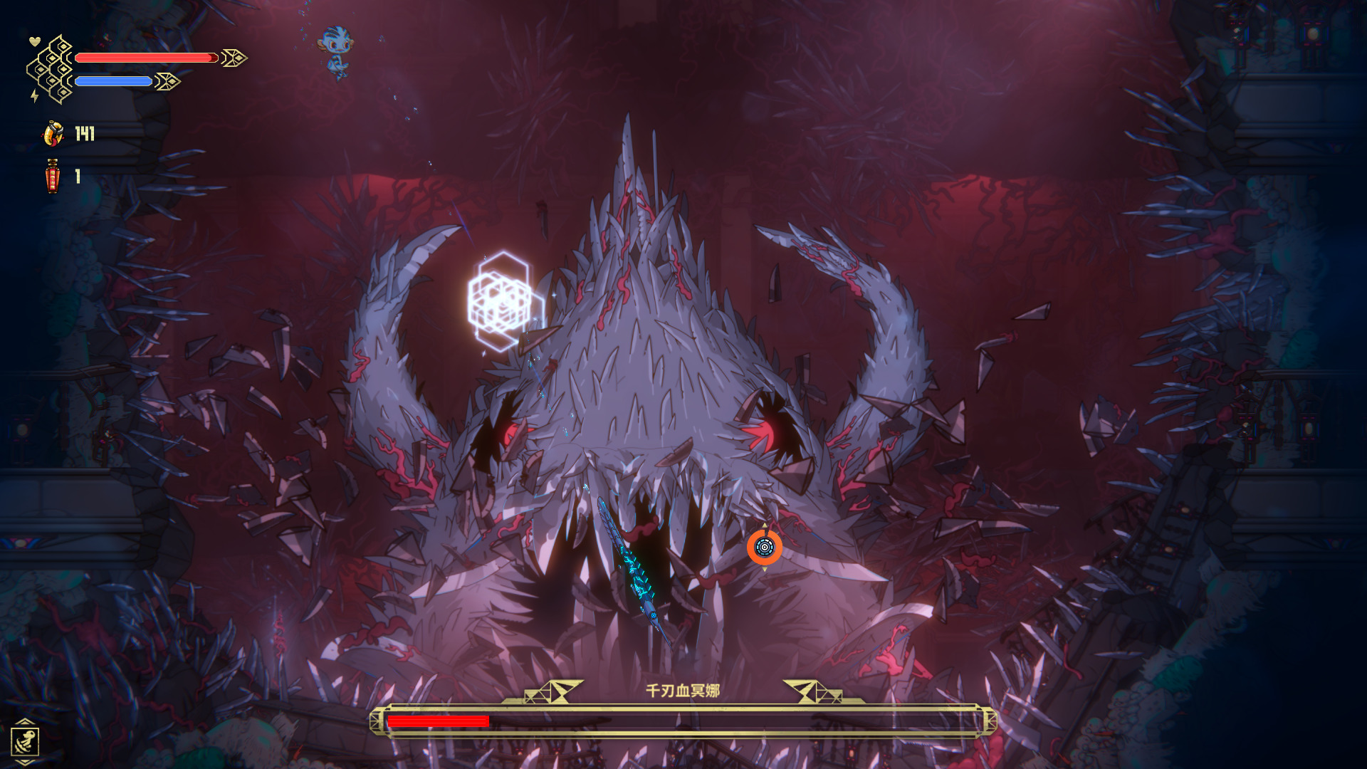 游戏的Boss也是多种多样,初见时都会不经让人感叹设计师的脑洞,让人印象深刻的一个Boss是千刃血冥娜,是一头尖刀遍布全身的鲨鱼,在狭小的布满尖刀的空间里和它搏斗,压迫感极强。