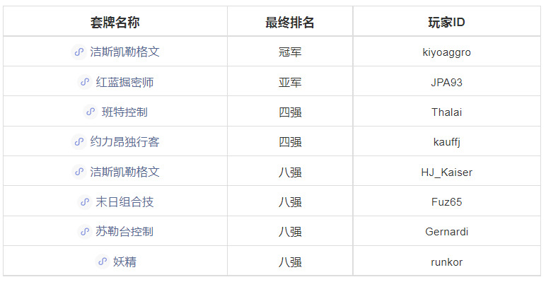 八强内有许多控制和节奏类套牌,比赛的最后是由洁斯凯勒格文夺冠