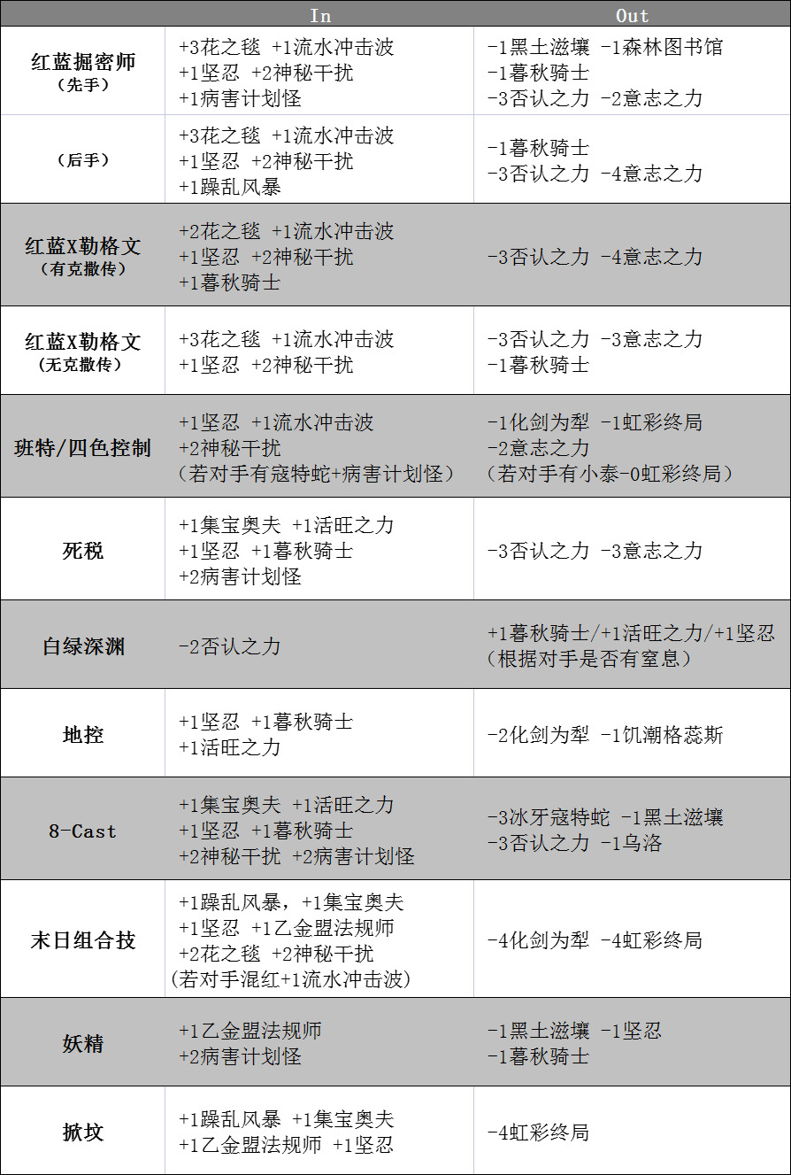 选择这套牌而不是黑绿版本的深渊套牌,最大的原因是能使用强大的白色去除咒语,如化剑为犁和虹彩终局,它们能够更好地处理勒格文和黯潮龙侯。如果使用黑绿深渊对阵勒格文套牌,会有很大风险被勒格文偷取组合技组件,甚至被偷取一个弃牌咒语也会非常难受