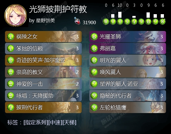 光耀圣狮是版本更新后表现最好的新牌之一。除了在守护教中大展神威,催生出自然进化教等全新思路以外,光狮还完美融入了护符教,替换掉伐罪狙击手、荣华加护神·亚忒朗图等鸡肋组件,与披荆代行者一同提升了这一思路的稳定性。