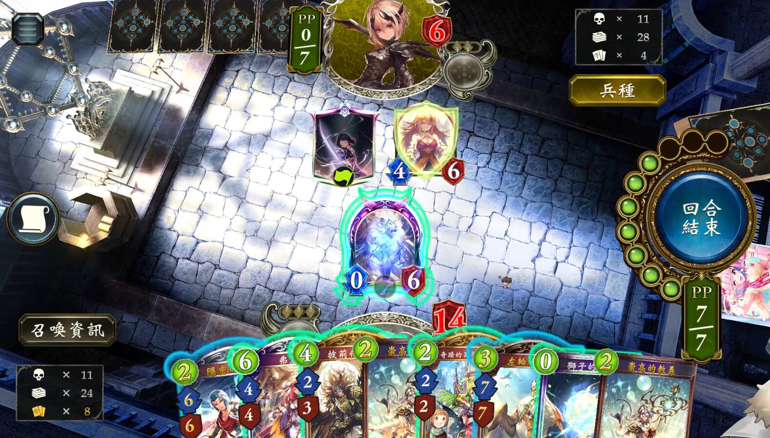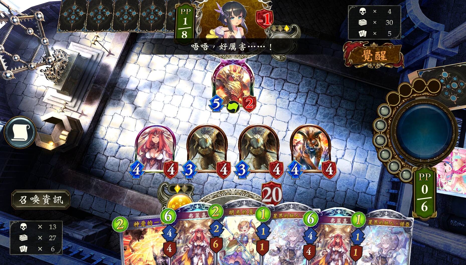 根据情况规划第6回合以后的动作,选择保留几张护符在场。如果准备使用弗丽嘉,且弗丽嘉能拉出4个护符,不要在场上留下护符。如果准备使用光耀圣狮,且不需要在第6回合使用狮子的祝福,优先保留1个护符在场到第6回合。如果准备使用光狮且需要用祝福打AOE和回血,优先保留2个护符。