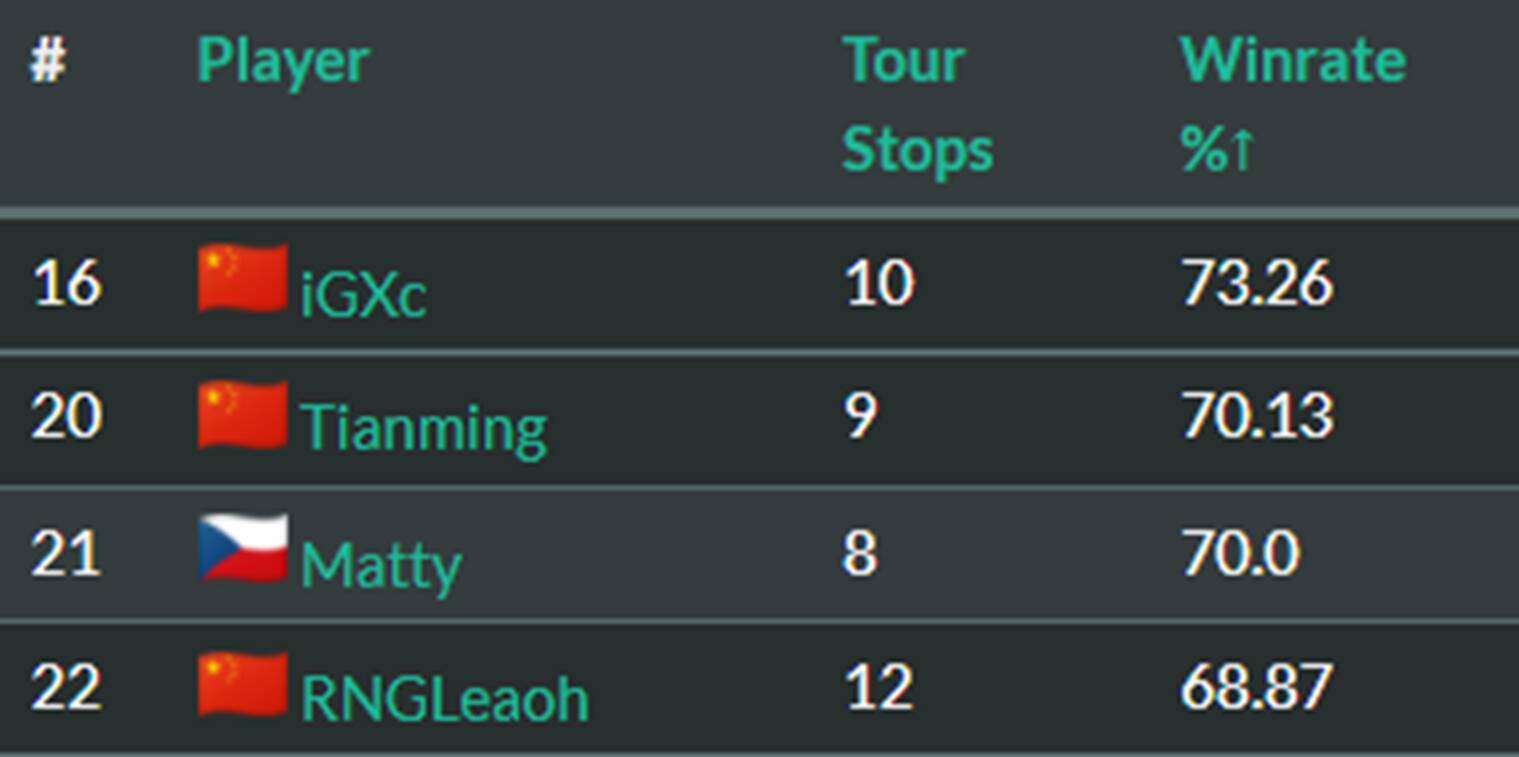 在某种程度上,国服本站战绩如果略有下滑也是可以理解的,因为这一站已经不在国服电竞体系内,但对外服的特级大师晋升却是至关重要的,外服选手理应对待得更认真;外服(欧洲)赛前也确实在备战上掏出了决斗法等新科技,也确实有好几人状态火热。结果国手依然十六强占6并会师半决赛,依然夺冠,而且这次国手整体进钱圈的比例还比以前高了很多(以前稳定在一半多一点,这次34/54)——也许光是冲这一点也不可能懈怠。