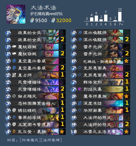 法师没有滤抽,靠英雄牌赢还是难了点,火冲法勉强可以带一张当第二终端。大法术法也不全看英雄牌,主要是大法师的符文起作用,多少有点尴尬。我的建议是多带点回血和墙,或许可以用监狱守卫架墙;奥术光辉不能滤抽还要求冰血哨塔,而巴琳达·斯通赫尔斯不仅能抽牌还能减费顺带站个大哥,我更倾向于后者。总体来说大法术法缺AOE,抗快还是太差,很可能要带火热促销赌一把。
