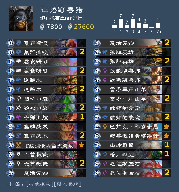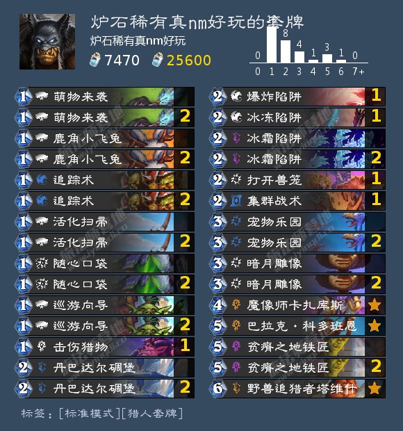 猎人的奥秘体系发挥作用太晚了,宠物乐园也需要场上奥秘配合,而后期靠兽王拉暴龙王,出场太晚而且场面很容易失控,慢速又不怕30血以下的OTK。只能看有没有在挂丹巴达尔碉堡的同时不亏节奏的办法了,1费刺头2费碉堡倒是可以换掉海盗战的2费,但是三四费质量站场只有宠物乐园和科尔拉克,科尔拉克还被海上威胁血克,要解掉最多也不过花三费。任务猎没有补强。