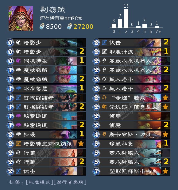 盗贼英雄牌塑影匠师斯卡布斯,战吼消失+5甲+召唤2个42潜行,技能相当于通用的伺机待发。这张牌强度相当高,而且因为2个42很可能会抬一手上面几张带AOE的英雄牌:两个影子配合战场军官保底打16,再加点配合直接斩杀也不是什么问题。很契合减费体系尤其是斯卡布斯·刀油,刀油连击+英雄牌+技能,手里又有一个0费刀油,凭空变出6费,当回合就可以完成防守反击,目前来看任务贼和操作药水的盗贼都可以带。另外这张牌对于铺场卡组来说相当头痛,不解盗贼的场面很容易被一张英雄牌转换为持续的资源压力,全力铺场吃一波消失又可能丢掉全部节奏。高效八爪机器人和放贷的鲨鱼也会因为这张英雄牌变得非常棘手,处理不掉可能就会输掉对局。