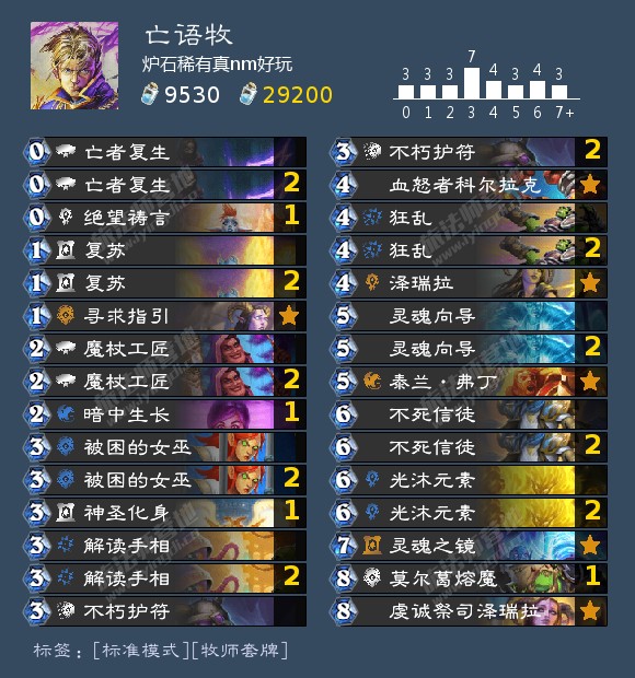 牧师英雄牌虔诚祭司泽瑞拉,8费战吼触发所有死亡友方随从的亡语,技能打5/奶5每回合切换。强度毋庸置疑,问题在于费用:狂野是很难用得上了,DK上限低些但战吼也够用了,也不需要铺垫,技能也更稳定;标准确实不乏强力亡语,但是费用都很高,要上手要打出要送掉,靠亚煞极神像拉的话黄花菜都凉了。这张就是典型的体系牌,目前的选择,一是走低费亡语流,暗影之灵、战利品贮藏者、亡首教徒配合德雷克塔尔拉怪,靠复活打节奏,墓园召唤补点高费质量亡语。但是这样就没有暗牧了,一来开赛集结是神圣法术,二来黑暗大主教是5费。那么牧师又要回到靠发现打资源的年初状态,可行性只能看快攻强度;二是任务牧,这个选项可行性更高,但是限制也更大,我有个想法就是靠8费亡语做7费任务,用贫瘠之地拾荒者或者龙族研习减费,否则一个灵魂之镜能把人等死,而雷象坐骑大概率吃沉默,这个我们后面再讨论。任务牧可以靠阶段奖励保证亡语上手率,也有稳定致胜方案,主要是靠英雄牌苟一苟,亡语主要是光沐元素、不死信徒和莫尔葛熔魔。当然任务牧稳被超凡和吃手手克制的问题还是没法改变,整体环境慢下来的话会比较尴尬。