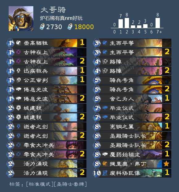 骑士新体系主要是大哥骑,由于舍己为人加入,大哥骑强度还算不错,但是骑士没有衍生手段,后期单靠这几个大哥推不死人,只能寄希望于发现的刀。而且刀的作用相当受限,挂刀当回合还要亏节奏,骑士又没有低费单解补刀,很容易被快攻推死。还是决斗简单粗暴,还有一定的针对能力。