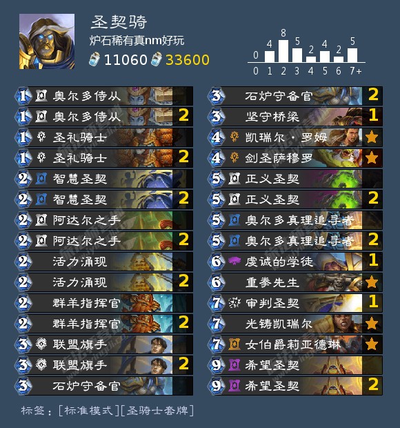 骑士是大哥骑和圣契骑,圣契骑加了重拳先生配合变身后的技能斩杀,带审判圣契主要是防软,并且增加一点打控制的机会。群羊指挥官可以配合圣契解场,或者换成活化扫帚。大哥骑估计没啥希望,五费砍不出大哥基本就凉了,而且从手牌中召唤比起决斗还是差的有点多。
