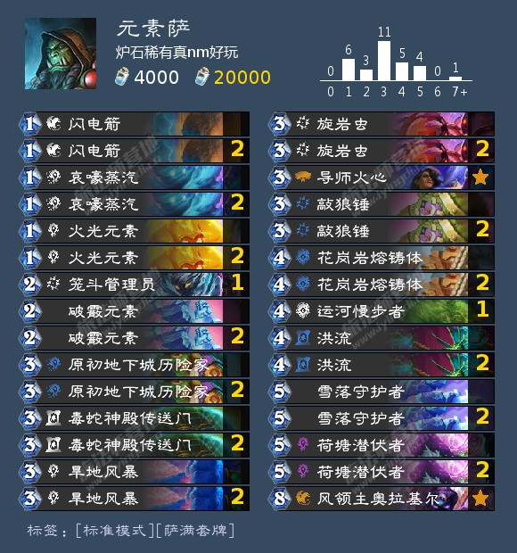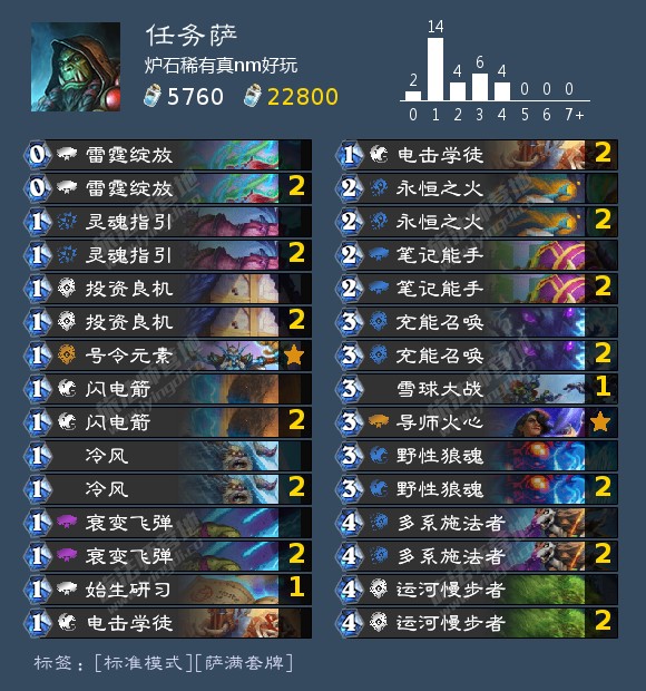 冰萨出的牌不弱,但是没有给出明确致胜点,我也只能把组件打散了放到元素萨和任务萨中。任务萨有冰的好处就是萨满不缺过牌了,多系施法者可以多抽一张。元素萨有了冰控场,算是一个重大加强。