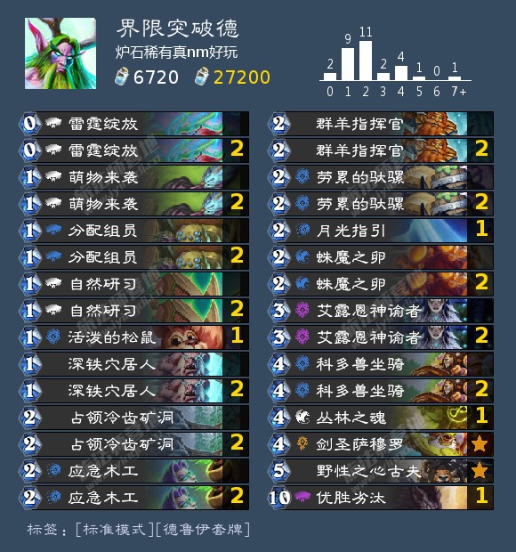 德鲁伊英雄牌野性之心古夫,5费跳费+5甲+抽牌,顺便提高法力上限至20。战吼和技能给的都是“实心”法力水晶因此几乎不会掉什么节奏。可以说是相当强势的一张牌,但是并不是强在上限提升的光环效果(超凡之下众生平等,10费20费没什么区别),而是强在跳费和过牌。一旦这张英雄牌上手,对局节奏将非常顺滑,能大幅提高超凡德的下限。但是面对快攻,基本也就是摇一次技能,相当于分两回合的滋养+抽一张牌,提升不大。总之是锦上添花的牌,目前来看要么配超凡要么配优胜劣汰,或许会有一套杂毛+优胜劣汰卡组?