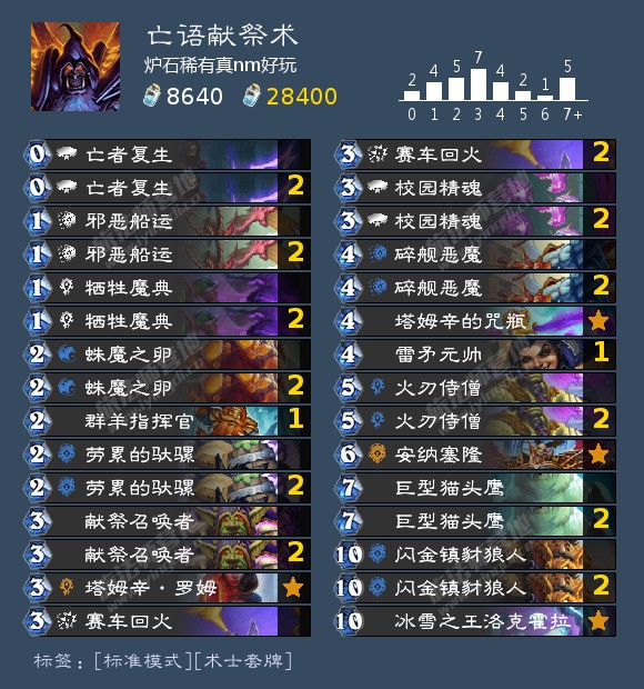 术士实在是找不出比任务术更强的卡组,只能从献祭召唤者出发。不带任务手牌多了一张,前期更容易拉满,可以1费安纳塞隆+献祭召唤者拉出巨型猫头鹰,然后乱炮打死老师傅;也可以4费雷矛元帅拉五费火刃侍僧,11费没有不知道10费怎么作用,如果是拉10费那就带上废料场巨像和血肉巨人各一个,目前带了个元素充数,至于亡者复生……还是去了好,现在就是充个门面。