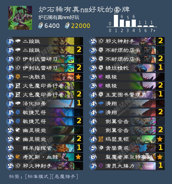 恶魔猎手英雄牌裂魔者库尔特鲁斯,6费战吼召唤2个4血恶魔,攻击力受英雄攻击次数加成,控场中规中矩,4血也不吃荣誉消灭。技能是重头戏,1费+2攻,随从攻击后重置,配合邪火神射手可以叠到看不懂的程度。但是有一个最大的问题:对手场面有这么多血量让你送吗?演员大接力需要一波14血的场面,而在死亡矿井前,海盗战还没肆虐的时候,我用猪猪猎总共只需要七血场面送怪(可以不连续),很多时候都要硬等到任务奖励。如今环境又降速,而控制卡组都是老折磨人,能让你痛快送掉14个伊利达雷?总体来看,DH的英雄牌相当吃环境,可以打快攻和比较笨重的慢速,但是打控制卡组游戏体验极差,版本老好人了属于是。