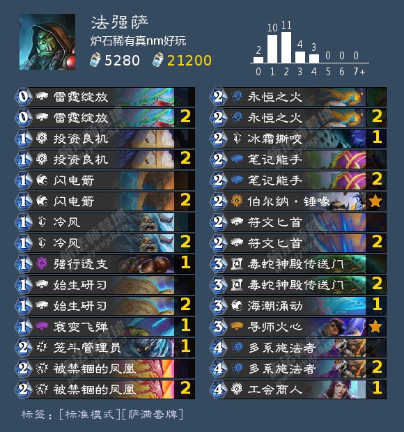 法强萨,主要思路是靠凤凰+刀法强配合4张直伤秒人,新版本加入了冰霜法术过牌,多系施法者上限也有提高。主要问题是如何定向抽多系施法者(历险家基本期望就是抽一张所以不带)以及·伯尔纳·锤喙的配合,如果不带魔杖工匠或许还是应该去掉锤喙。