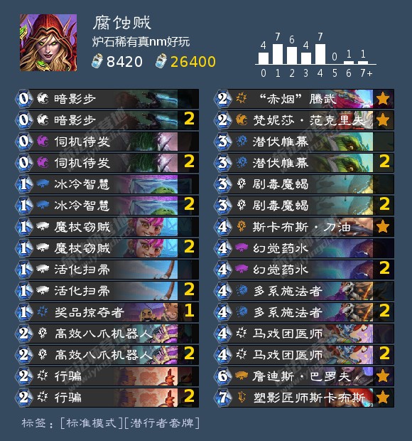 腐蚀贼最大的问题是能否摆脱原野联络人,联络人并不弱,但腐蚀贼大量的4费以上战吼导致联络人上限不高,秘密通道也是如此。我的一个想法是多系施法者,盗贼有暗影、自然、冰霜、奥术法术,可以用梵妮莎·范克里夫偷对手的法术,再加上魔杖窃贼找法师法术,上限不低,下限也能过两张。其他的配合牌,魔杖工匠能拿自然法术,而且1费有过牌还有脏,但是实在太杂;剧毒魔蝎比较稳定选择更多,能配合扫帚解大怪,但是还是盗贼的法术;钥匙守护者艾芙瑞可以找到自然和神圣法术,资源更多,但是费用高太笨重,环境降速后是首选。还有一个可能就是传统的疾跑过牌,带少量法术用行骗进行检索,但是法术为过牌核心的问题就是容易夹断,而腐蚀贼需要大量配合牌,夹断率不言自明。
