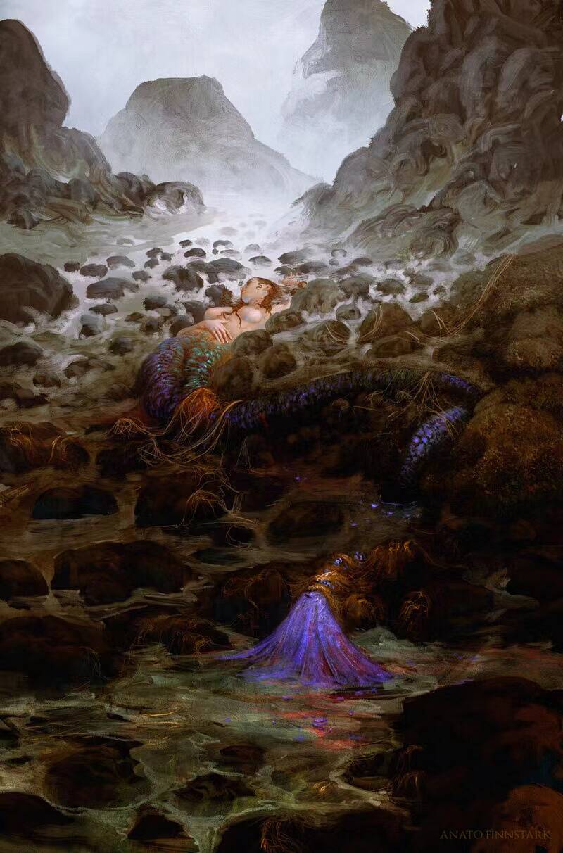 灰褐的山石,白色的烟水。人鱼搁浅在石滩中,尾巴的磷光若隐若现。尤其是画面下方,她的尾巴的末端泼洒在水面上,星波流转。