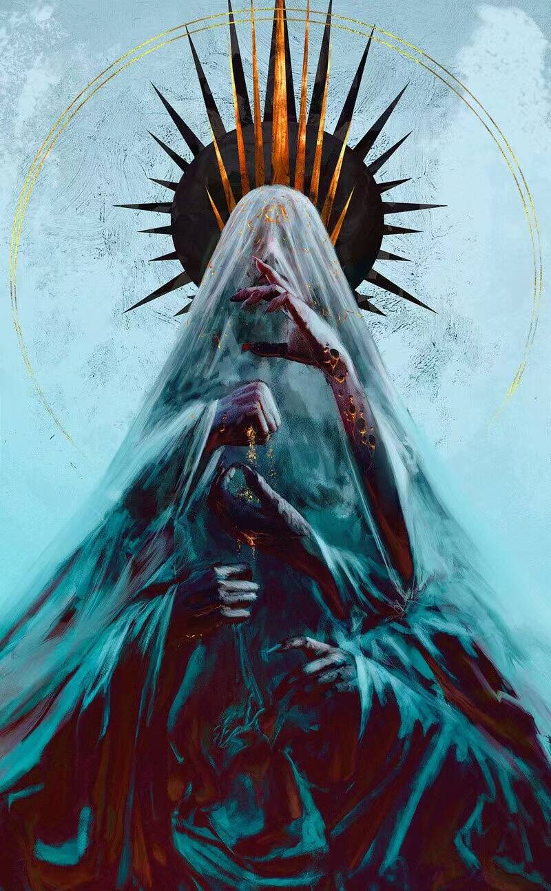 在我找这张图的原画的时候,竟然翻遍全网都没有…没有被放出来,画师你好狠的心啊!明明其他的谎言神,甚至连百花宗师都好好的贴在了主页上,唯独没有Anje,真的是太遗憾了。我纠结了很久,因为不想放弃这位画师的这副作品,最后我还是尽量找到了一个较为高清的图片—— MTGA现开封面。