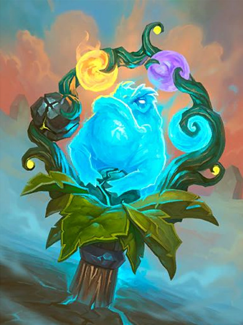 作为本套卡组的绝对核心,青蛙之灵共有两大特点:其一是其独特的抽牌机制,打出0费法术可以定向抽取1费法术,1费可以定向抽取2费,以此类推。并且因为抽到的法术在本回合内可以再次打出以抽取更高一费的法术,所以只要费用充足,且控制牌组内法术的数量和异能,理论上我们可以在1回合之内抽空所有法术,打出12张以上的法术且制造11点过载,从而在当回合让所有巨人入场。