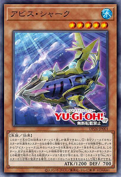 ①:自己场上的怪兽只有水属性怪兽的场合才能发动。手卡的这张卡特殊召唤,从卡组把「アビス・シャーク」以外的1只等级3~5的鱼族怪兽加入手卡。这个回合,自己不是水属性怪兽不能特殊召唤,自己的「编号」怪兽和怪兽间的战斗给与对方的战斗伤害只有1次变成2倍。