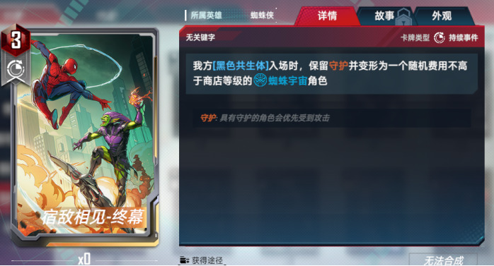 我方黑色共生体入场时,保留守护并变形为一个随机费用不高于商店等级的蜘蛛宇宙角色