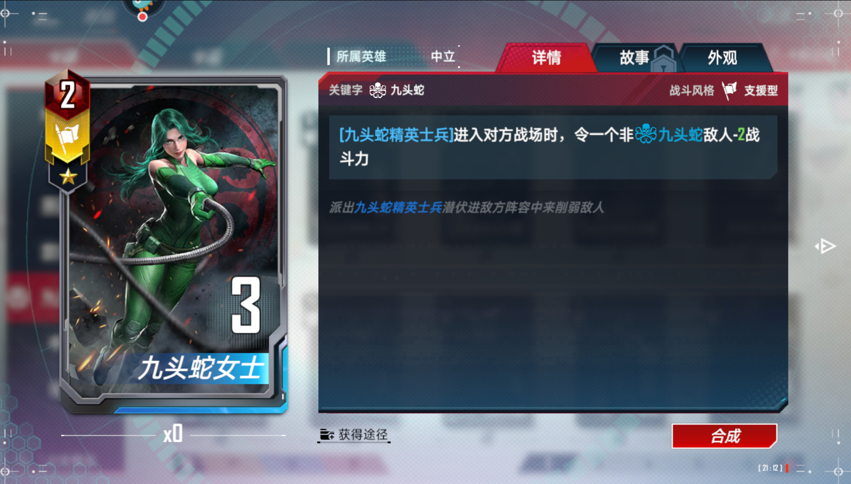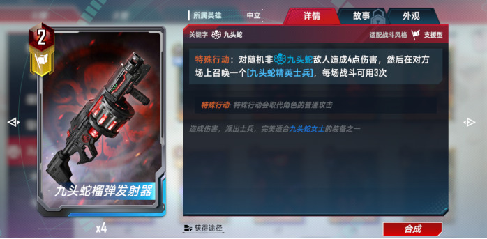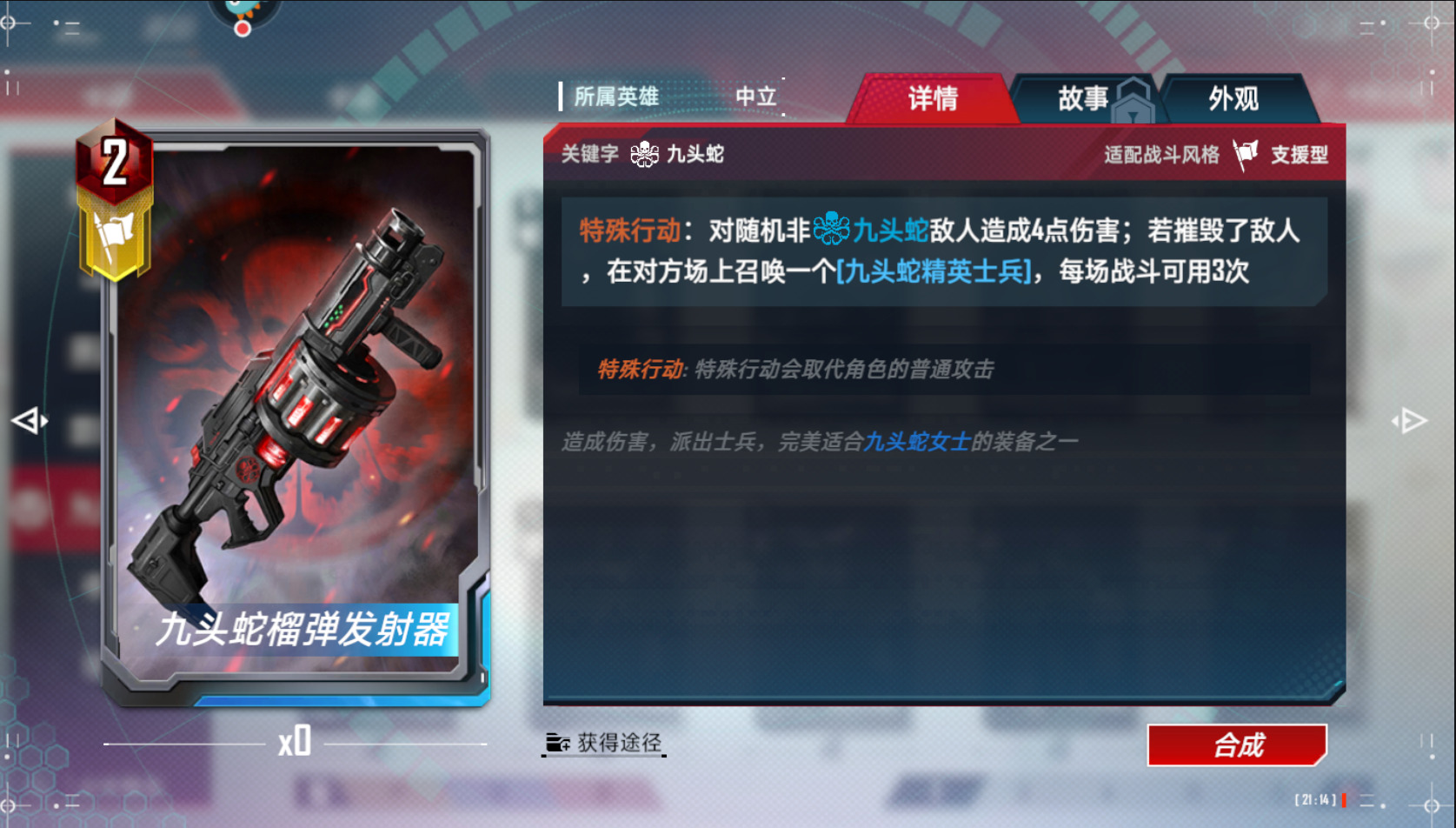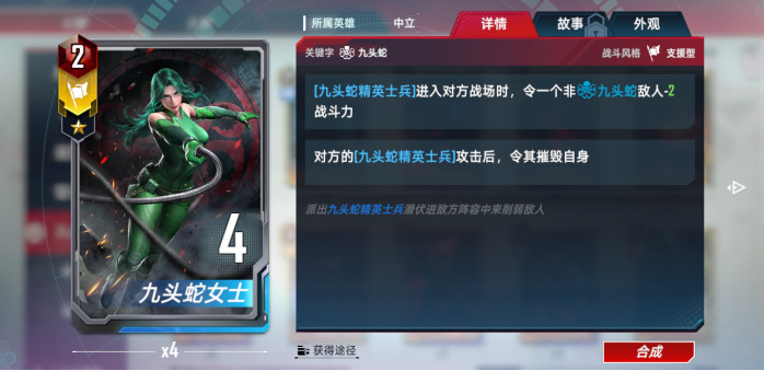 特殊行动:对随机非九头蛇敌人造成4点伤害,若摧毁了敌人,则在对方场上召唤一个九头蛇精英士兵,每场战斗可用3次