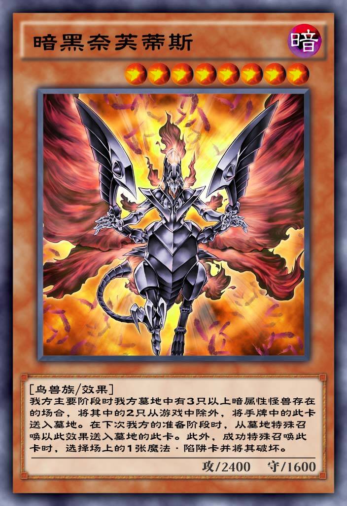 1效果可以增加本家凤凰不堪2400的攻击力,主要是2效果在被效果破坏的时候可以调度卡组奈芙提斯,属于本家卡组特招了是很好用的,凤凰卡组可以下。
