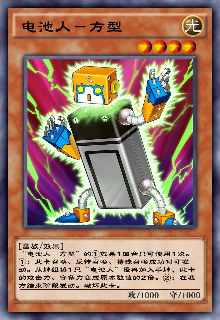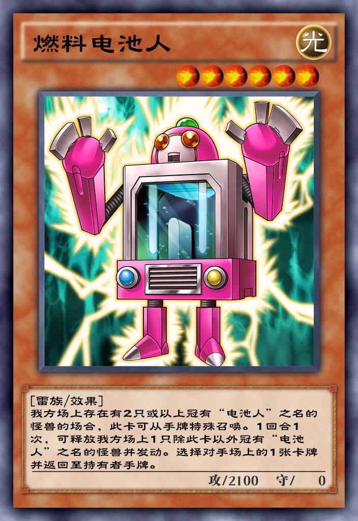 电池人的核心怪兽,场上有电池人就可以特殊召唤,而且可以解放电池人解场,属于不错的效果,一般的combo是充电拉角型,角型找燃料,燃料直接跳。