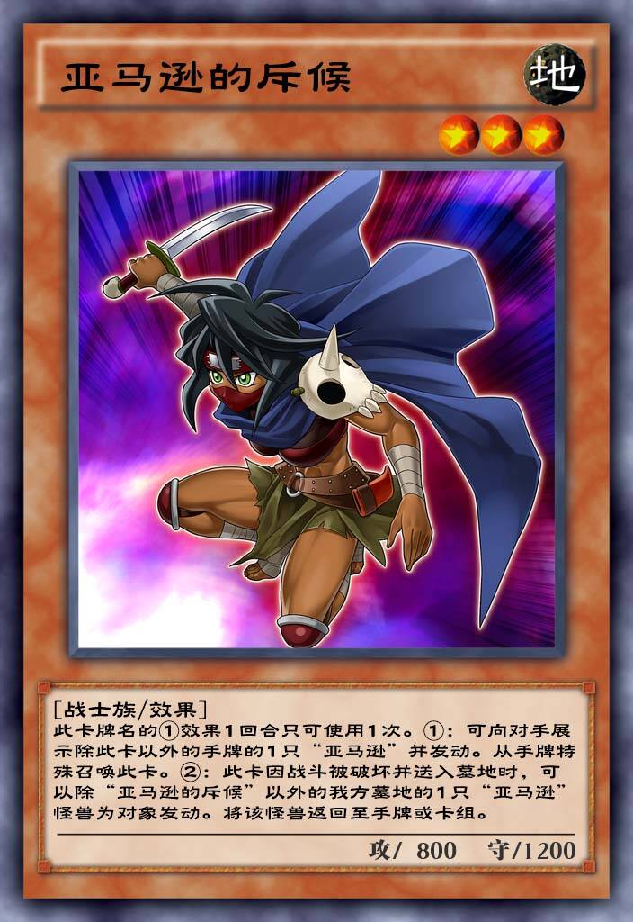 突袭魔女都来了亚马逊还会远吗?这张卡英雄卡组也是需要的,这张卡的出场条件属于比较容易的了,可以献祭陷阱卡出场,本身在国际服可以配合亚马逊的永续出场的,而且出场后可以炸后,让无论是英雄卡组还是亚马逊卡组的otk安全性得到了保障。而且这张卡是暗属性的英雄怪兽可以通过假面变化变暗鬼,所以暗鬼卡组是可以投入1的,当然别下太多卡手也挺卡的。