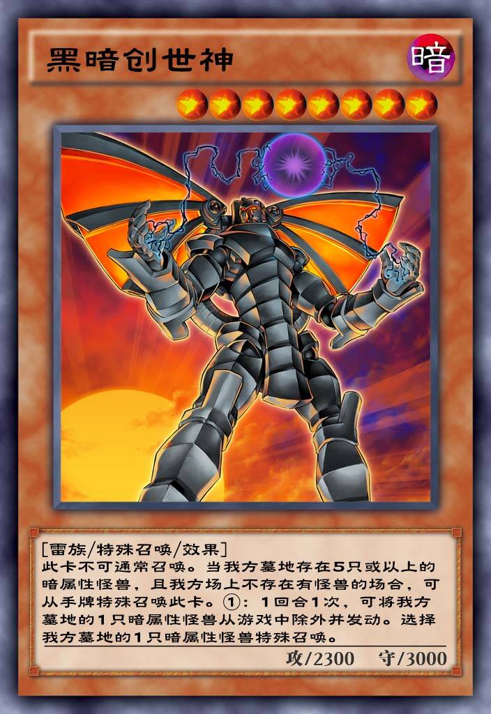 黑化后的创世神,不能被通常召唤也是通过墓地的怪兽数量凑够条件来特殊召唤,可以每回合除外墓地暗属性苏生暗属性,没啥用建议别抽。