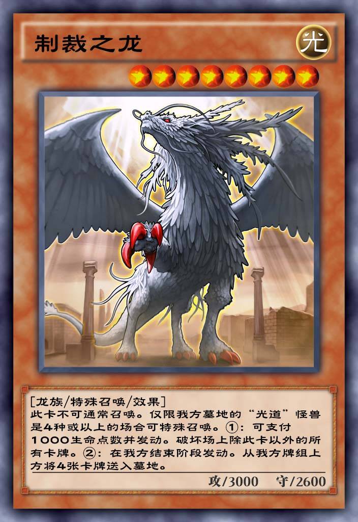 光道扛把子大哥,封面怪牌面。千呼万唤始出来,国服给这张卡属实配得上加速的环境了,国际服出的时候已经相当的靠后了。只能用自身的条件来进行特殊召唤,但是登场后可以支付1000生命值来清场,如果没有圣杯之类的卡可能就要被otk了。当然光道老生长谈的一个问题,3裁决龙进墓地别忘了投降,这玩意不能被复活的,但是可以用死者转生等回收。