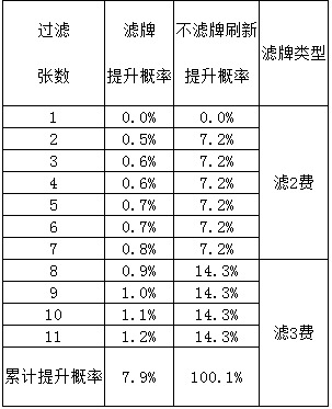 | 过滤张数 | 滤牌提升概率 | 不率牌概率 | 滤牌类型 |