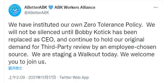 而在该报道今早发布后,动视暴雪员工组成的联盟“ABK”也于今日凌晨发表推特称将抵制鲍比·科蒂克的领导,呼吁他立刻下台、重申更换第三方审查诉求并将再次举行罢工示威活动。