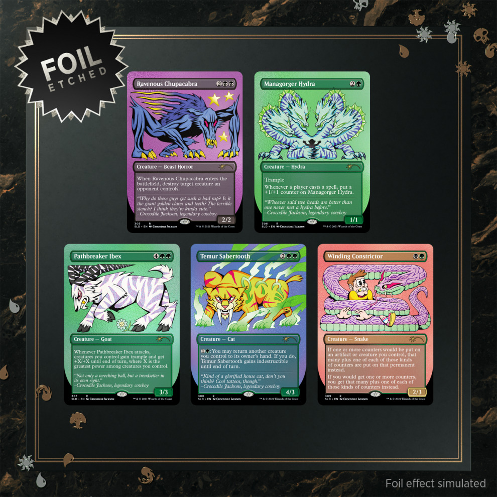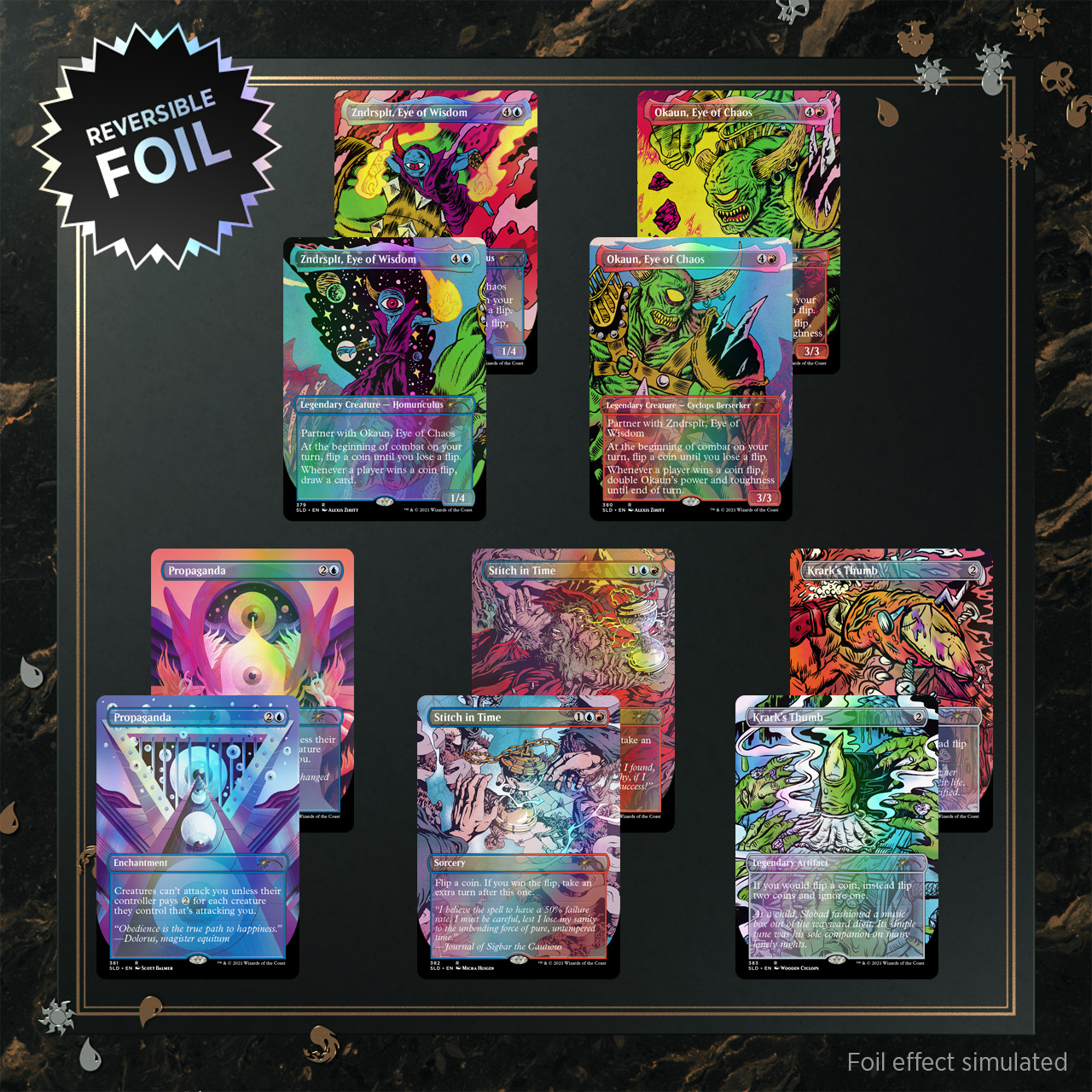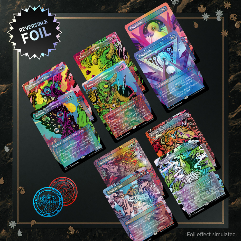 一整套硬币主题的指挥官预组,包含5张翻转闪重印(单面牌,但是两面印了不同画的牌面,有点像硬币),45张闪重印,50张平重印,2张厚指挥官牌,10张双面衍生物