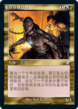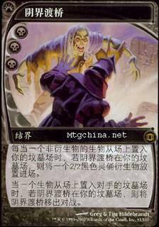正如上文提到的,如何有效的使用发掘十分关键,这些发掘源能够把梦生阿米巴、珍奇拼合怪乃至寒意蔓延和灵液妖这样的牌统统带出来。阴界渡桥,这张只在坟场才会发挥作用的奇妙牌是整套牌让人眼前一亮的关键。这张牌的两个触发式异能都是由它的拥有者控制的,明白这一点对处理场面上有可能发生的兑子非常重要。在这些场合,你可以排列两个异能在堆叠上的顺序,让你坟场中的渡桥被放逐之前能够留下一个灵佣token。这种场面还是相对常见的,更有意思的情景是用恶毒复生响应渡桥的放逐异能把它捞回来。恶毒复生这张牌还有很多大用途,无论是从对手的手术摘除和导灵明灯那里刀下留人,还是捞个关键咒语放牌库顶用市集抓回来。