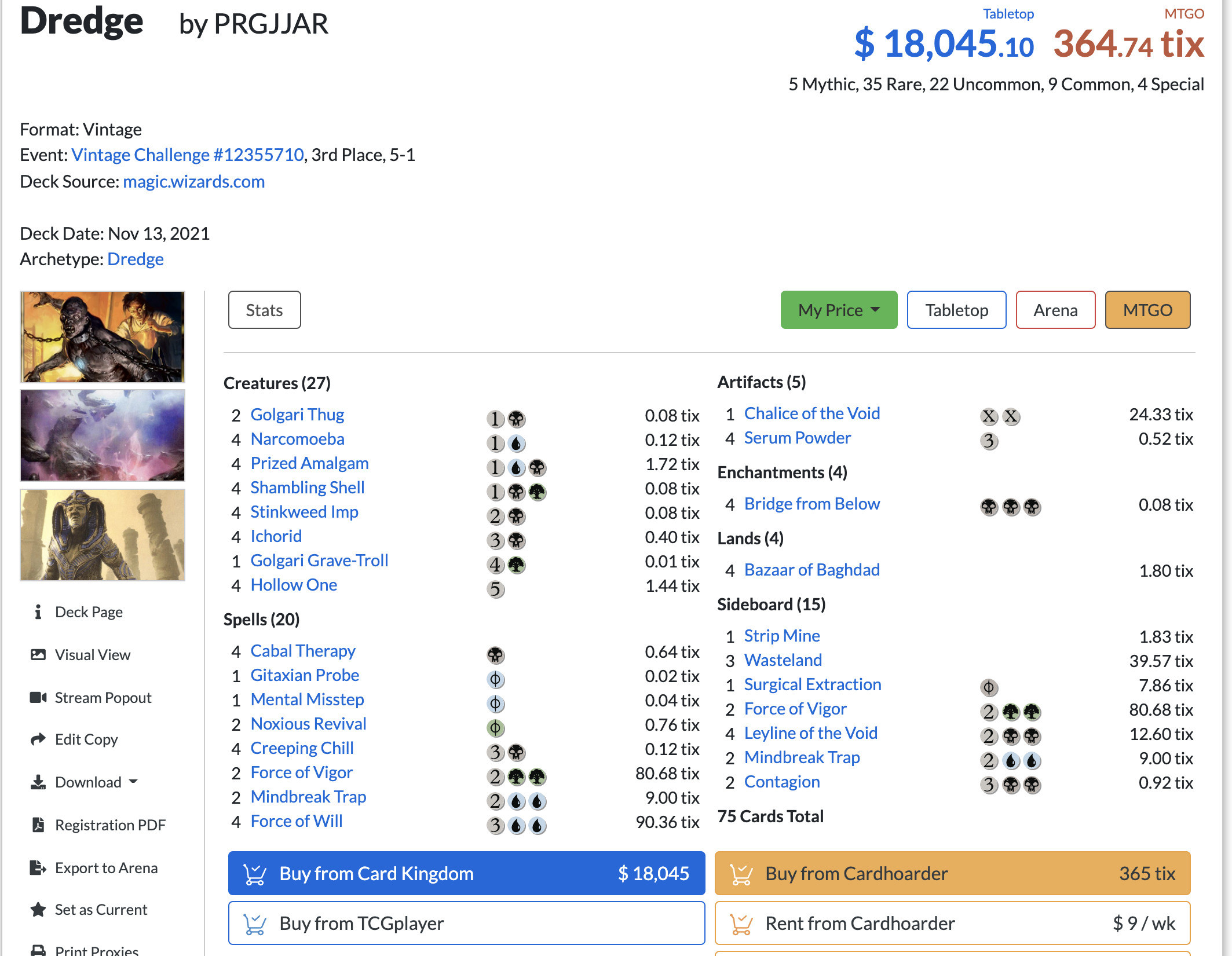 共计365T,其中价格超过10T的牌是活旺之力(一组160T)、意志之力(一组90T)、荒原(3张40T)和虚空圣杯(24T),这12张牌的价格占据了整套牌的90%,而且它们都是其他永久赛制的硬货(活旺之力还是最近克撒传抬上来的)。其他的特选套牌在MO上的状况基本类似,已经持有摩登和薪传套牌的牌手们如果想试水特选赛制、或者只是为了换换口味去参加这次永恒周末的话,只需要以极低廉的价格购入特选单卡(比如P9工作室市集等)和其他拼图即可。