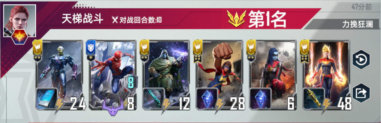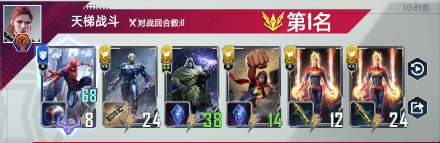 (2)、有的同学会说,光谱也是从左向右打,会杀死你的工具人的,没事,我们见招拆招就行,本文提供一种新的阵容,专门针对光谱:即把5费复仇者蜘蛛侠放在第一位置,稳定眩晕光谱全场,然后我方工具人逐个多动后,从宇宙中召唤惊妈和惊爸,稳定贯穿全场。