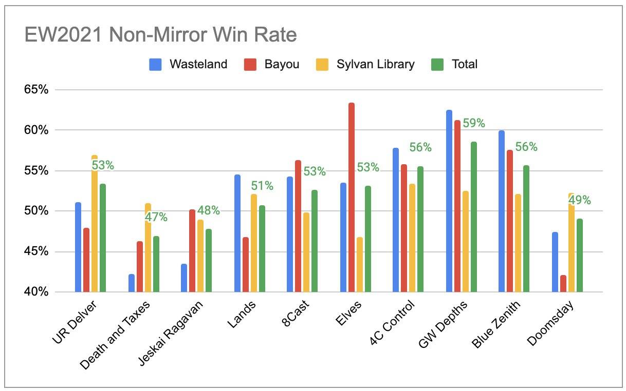 不过,人们讨论的焦点仍是……勒格文。勒格文套牌在比赛里极其受欢迎,但是查看红蓝掘密师的数据时,会发现其非镜像胜率并不是很高(约53%),看起来很是健康。而一些非勒格文套牌有很高的胜率,比如白绿深渊、四色控制。那么环境真的能自我调整吗?